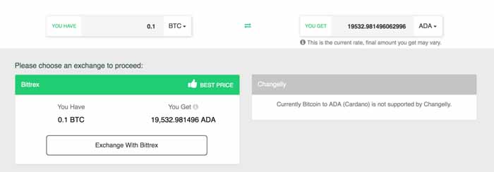 2.Here you will see the list of all exchanges with ADA quantity. Choose the best exchange to convert BTC to ADA or choose the one recommended by us.